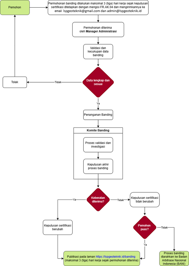 - Untuk Banding silakan disampaikan secara tertulis dengan mengirimkan pengisian formulir Pengajuan Banding melalui email ke lspgeoteknik@gmail.com dan admin@lspgeoteknik.id